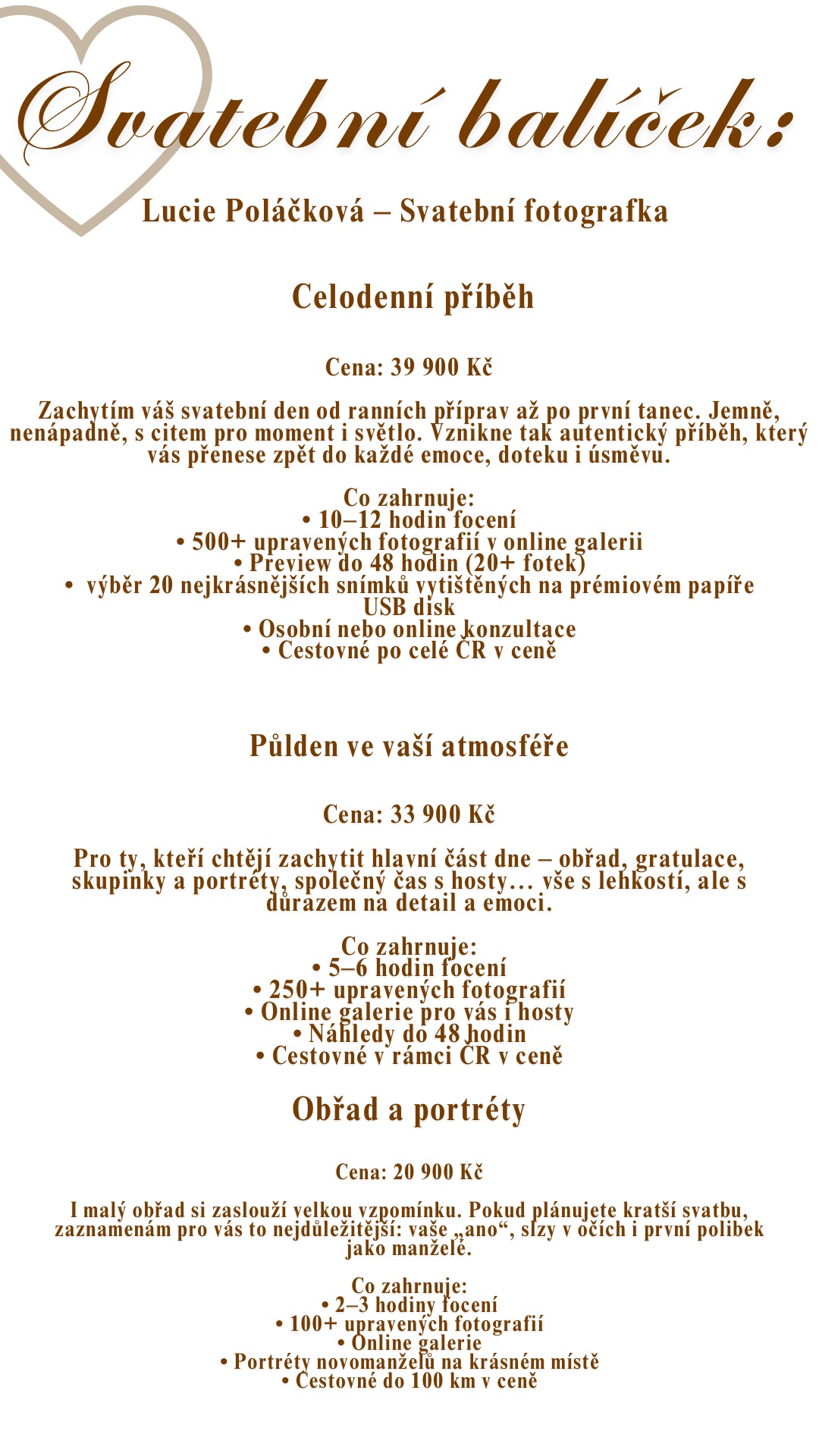 Doporučuji celodenní focení, abych mohla zachytit celou škálu emocí a událostí od ranních příprav až po závěrečnou taneční zábavu. Snímky Vám připomenou ten moment napětí a radosti před obřadem, který se pak promění v nezaměnitelnou euforii a všechny obavy z vás rychle opadnou. Mým cílem je, abyste se přirozeně cítili a dokázali se uvolnit. Zbožňuji každý detail, emoci a zaznamenávám kouzelné momentky - to dělá váš svatební den nezapomenutelným.